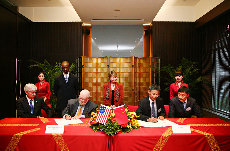 現(xiàn)場氣氛熱情友好,三位睿智而又幽默的發(fā)言贏得了現(xiàn)場觀眾的不斷笑聲與熱烈掌聲。簽約儀式尾聲,州長先生特意將兩支簽字筆,分別贈送給木霸克公司總裁詹姆斯·舒馬克先生和綠友集團總裁李敏先生,并合影留念。