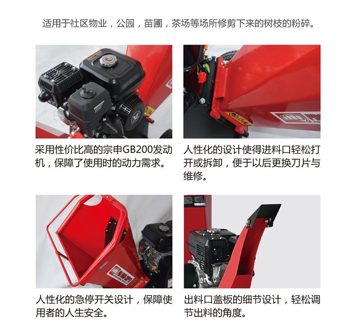 1.整機(jī)小巧靈活,適用于社區(qū)物業(yè)、小型公園、苗圃管理、茶場等綠植的碎枝作業(yè)。